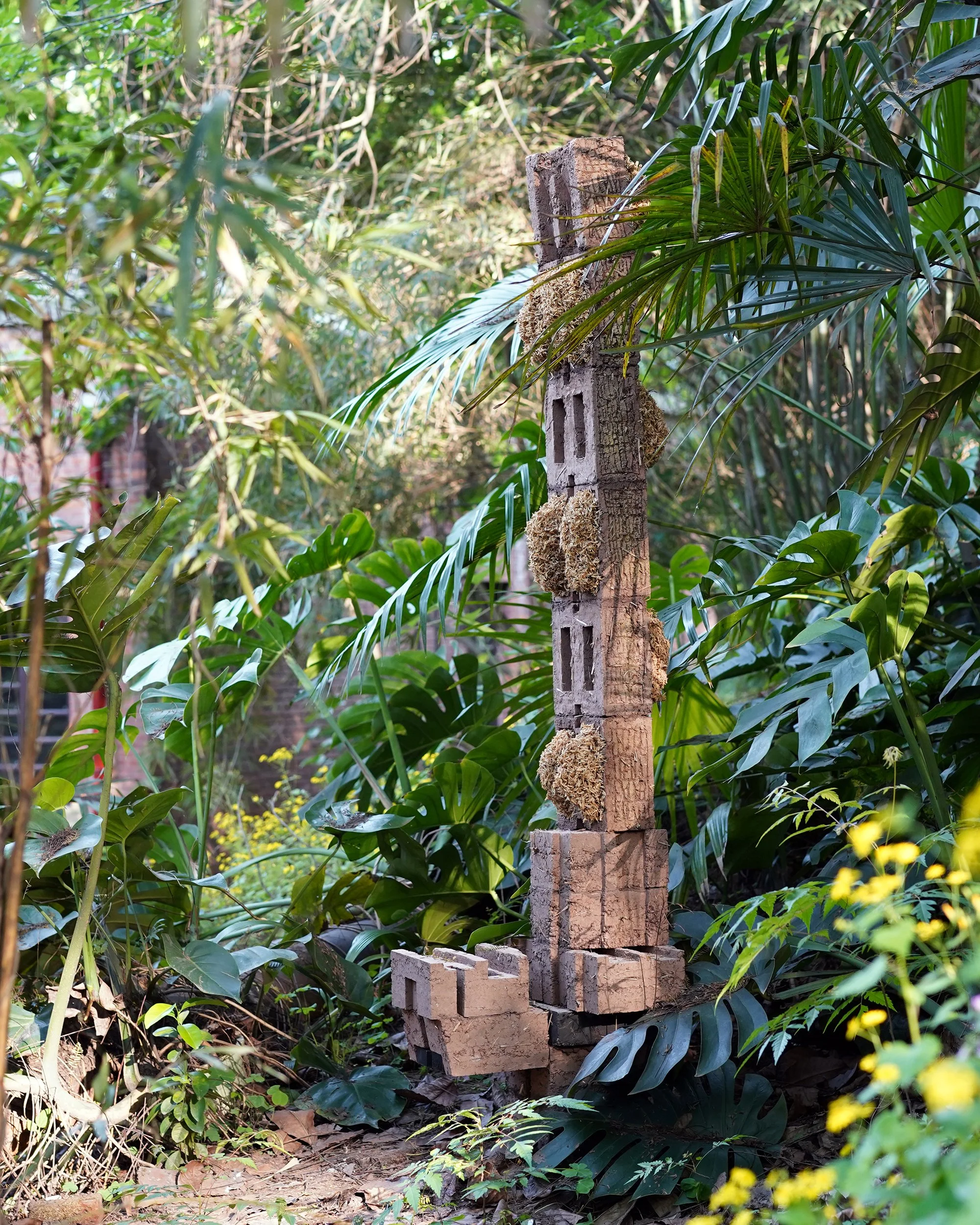 Xi gathers material on the spot including soil and plants to create his works. Surrounded by mosses, ferns, and seed plants, the hand-made adobes are arranged solidly in a structural manner. This is the most iconic series of his works whose titles are quoted from classical Chinese literature: the Book of Songs and the Songs of Chu, such as It is Nice to be in the Garden, There is a Sandalwood (乐彼之园,爰有树檀) (2019), Swoop Flies that Falcon, Dense that Northern Wood (鴥彼晨风,郁彼北林) (2020), and The Appearance and Height of the Lush Plants Match Beautifully (纷緼宜修) (2020). Xi borrows these responses from ancient Chinese philosophers to the rhythms of nature, alluding to the unity of the abstract structure and figurative content in his works, and the fusion of classical Eastern aesthetics with Western spatial geometry. Legitimately, Xi calls his works "Land Art" rather than installations or sculptures. In terms of Land Art, it uses nature as the creative medium, and always emphasizes the visual form of the site-specific context, looking for an organic integration between the works and nature. One Issues from the Dark Valley and Removes to the Lofty Tree (出自幽谷,迁于乔木) (2019) , one of the series of adobes, created in 2019 and eroded back to the land during the rainy season in 2021, which is a vivid projection of the journey of human life.
